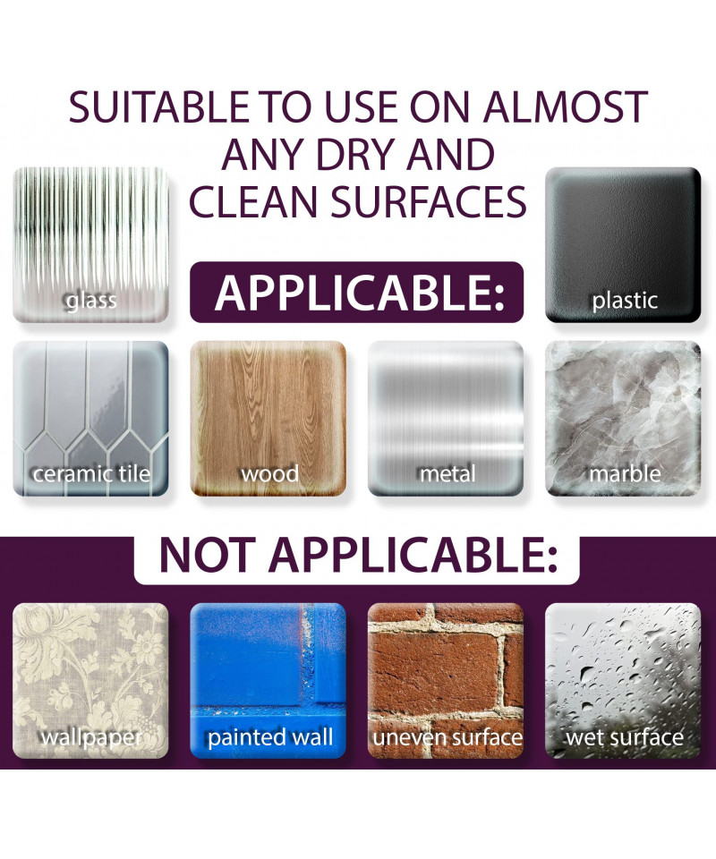 SUITABLE SURFACES: double sided tape dots are designed to work on any clean & smooth surface. Best matches are tile, wood, plastic, glass, metal, stone. We do NOT recommend using mini glue dots on wallpaper, painted walls, drywall - such surfaces may be damaged upon removal due to high bonding strength.